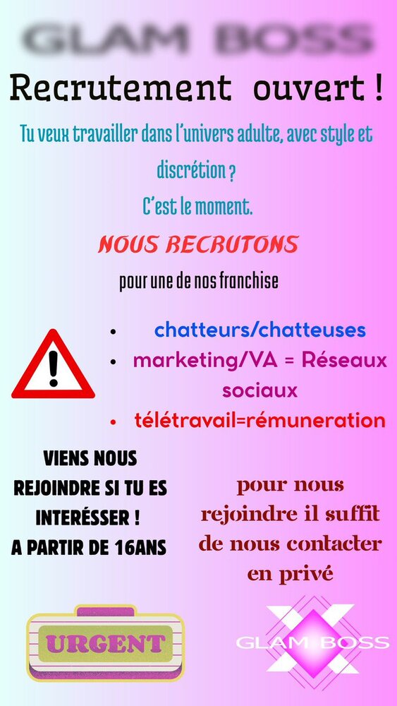 ? RECRUTEMENT – GLAM BOSS ??? Taf à domicile? Chatteurs (18+)?? VA / Réseaux (16+)✅ Pay ...