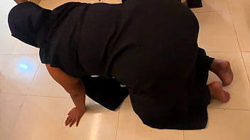 Heiße ägyptische Stiefmutter steckt beim Putzen im Schrank fest und öffnet ihren großen Arsch für Analfick 3 Min